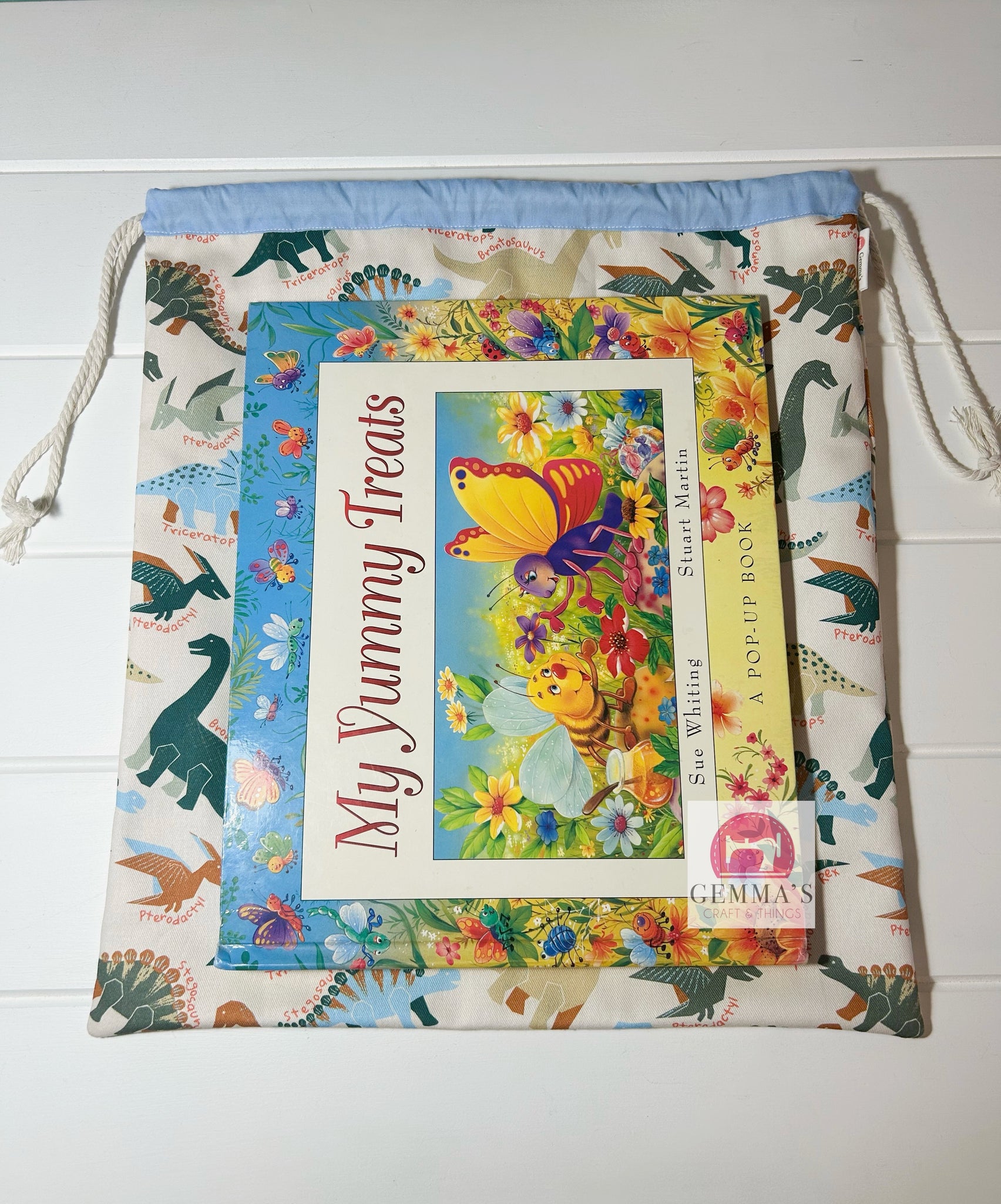 Library Bag Measures approximately 36cm wide by 40cm tall. Lined with plain cotton with a drawstring closure easy for little hands to use.