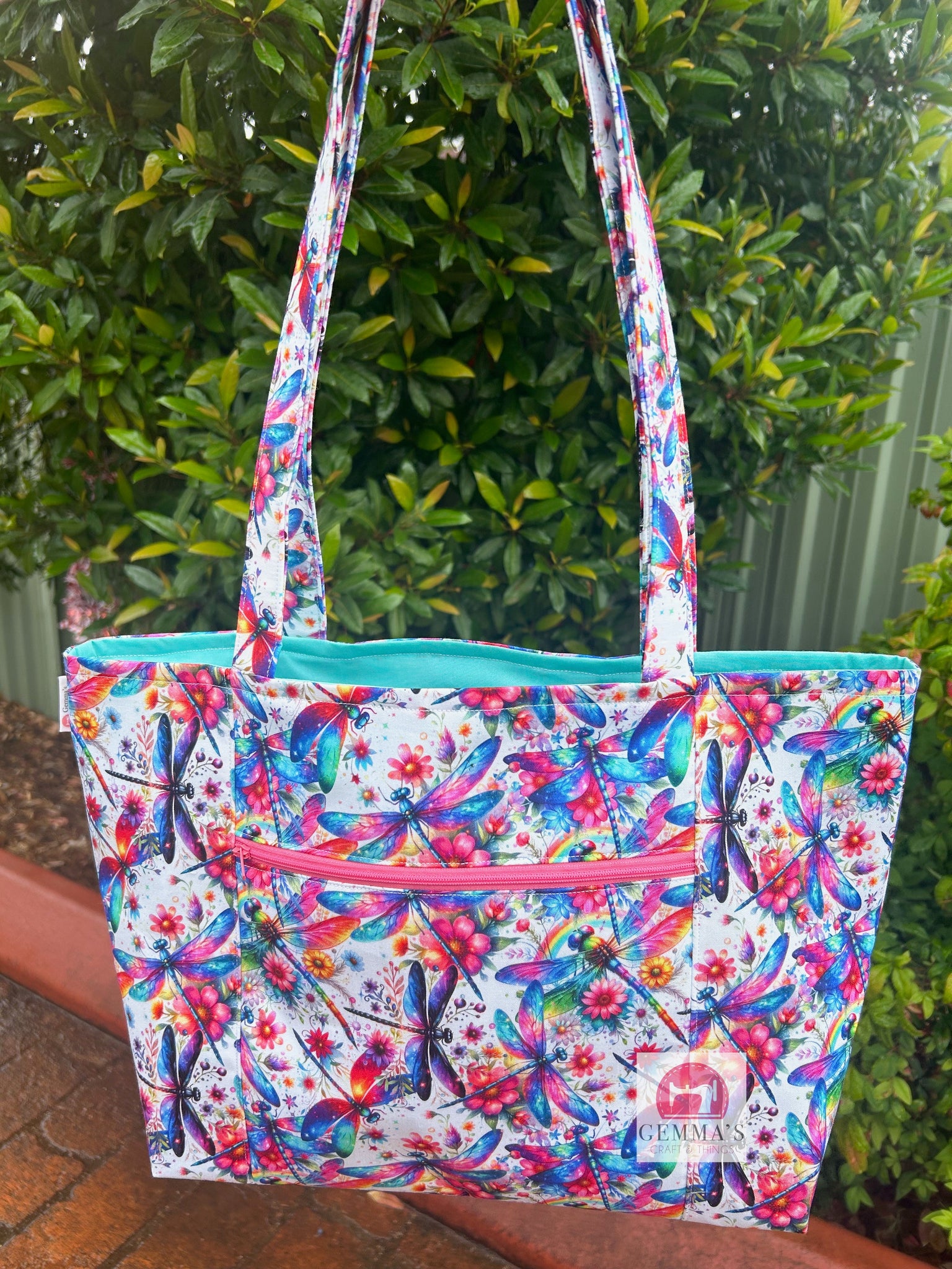 The bag is lined with plain cotton and interfacing with a large pocket at the front of the bag with a zip